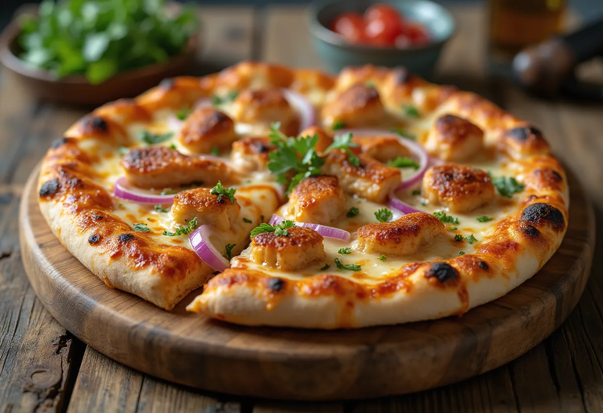 Spotkanie dwóch światów: chrupiące ciasto włoskiej pizzy niesie dymne, pikantne smaki indyjskich pieców tandoori. Kwasowość marynaty jogurtowej nadaje kurczakowi kruchości, a w gorącym piekarniku (imitującym tandoor) karmelizuje się on wraz z serem.